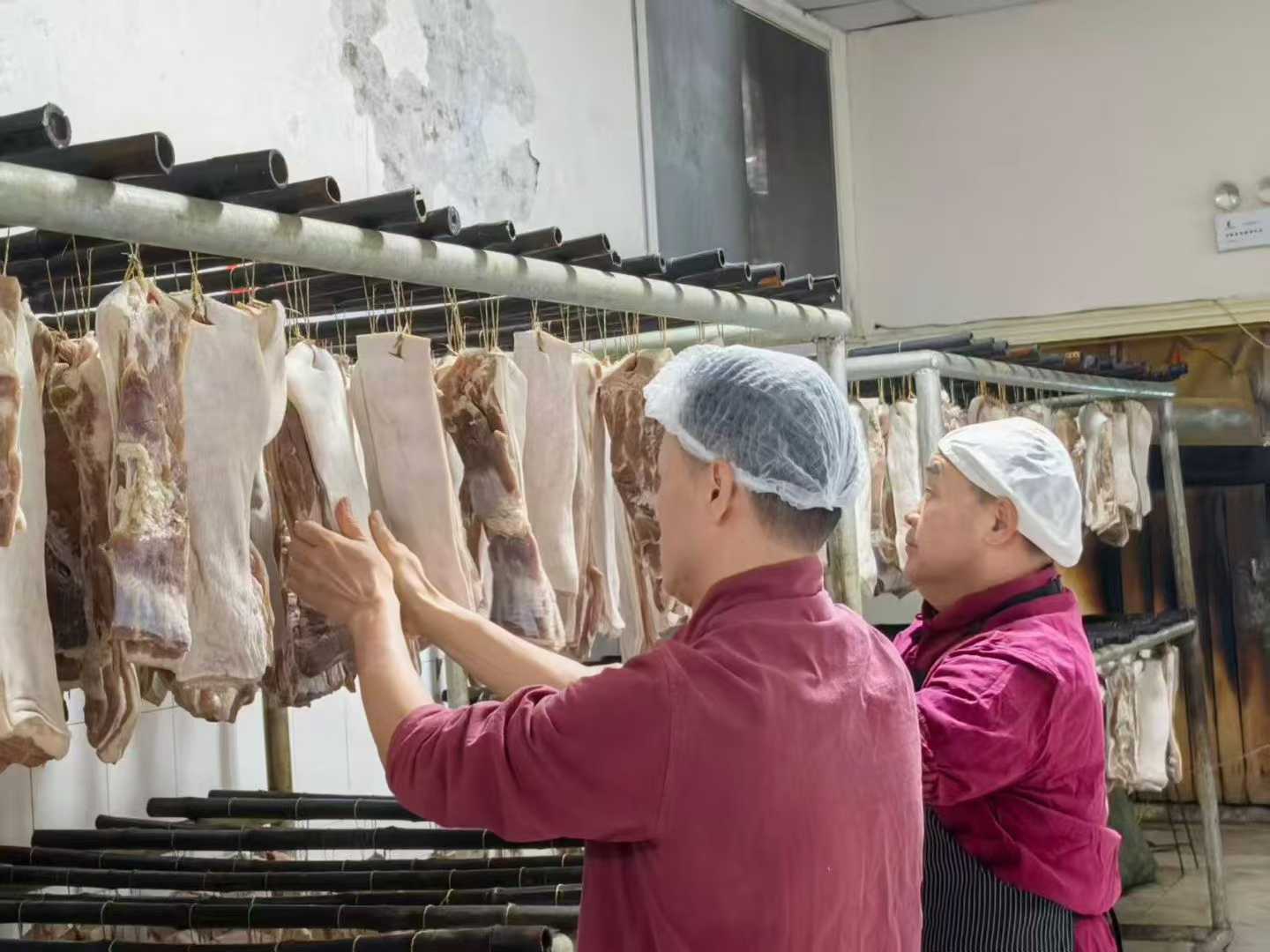 做藏香黑豬臘肉,我們還是守著老規矩來!精選豬五花、后腿肉這些好部位,用自貢井鹽搭配本地花椒、桂皮手工揉腌,腌夠7天再翻一次身,確保每一寸肉都吸滿香料味。之后掛起來曬足山風日曬,最后進烘房用松柏、橘皮文火慢熏20多個小時,沒有任何添加劑,全靠時間和手藝沉淀出醇厚臘香。